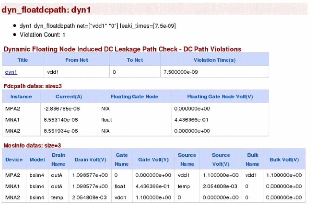 This example reports the high impedance node induced DC leakage paths between the nets vdd1 and 0 at the specified leaki times based on leakage analysis. This examples displays the following report in the Web browser.