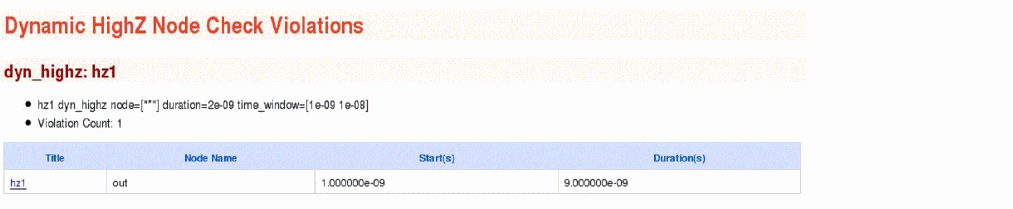 The above command will report all nodes that were in a high impedance state for a duration longer than 2e-09s within the time window between 1e-09s and 1e-08s. The following is an example of the report that is displayed in the Web browser: