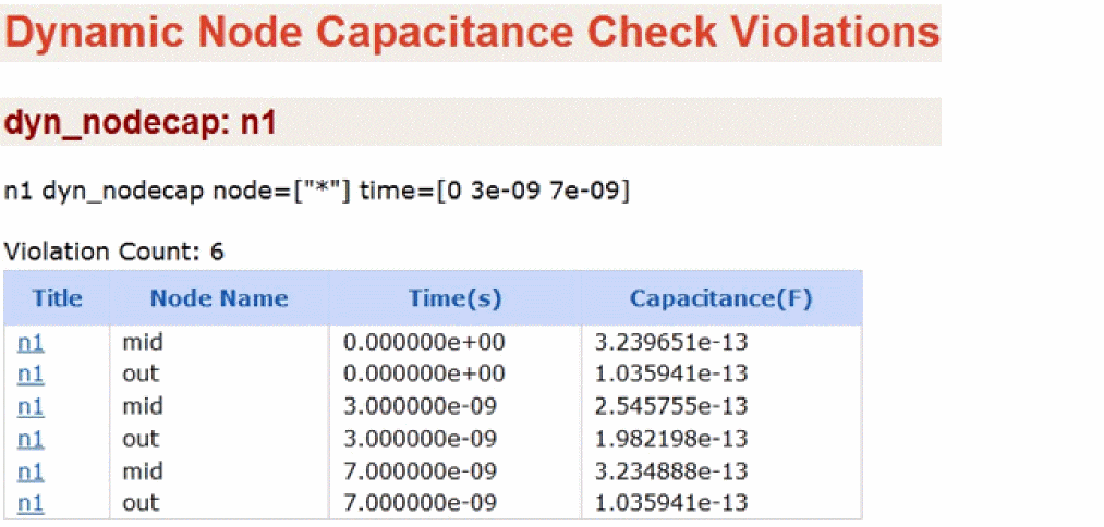 Reports the node capacitance at the specified time (time) of a transient simulation. Device capacitances, voltage dependent capacitances, grounded and coupling caps are combined into one value. The results are written to a file with the extension dynamic.xml, which can be viewed using a Web browser.