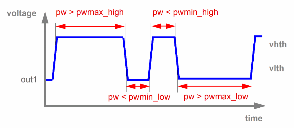 Similarly, the pulse width of a logic high state signal is the duration between which the signal crosses the high voltage threshold (vhth) while rising and again crosses vhth while falling. If this duration is outside the range of pwmin_high and pwmax_high parameters, the dyn_pulsewidth check reports the pulse width of such signals.