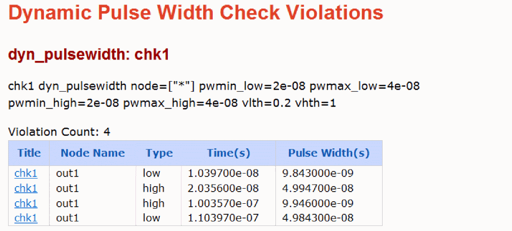 title dyn_pulsewidth node=[n1 n2...] pwmin_low=<value> pwmax_low=<value> pwmin_high=<value> pwmax_high=<value> vlth=<value> vhth=<value> time_window=[start1 stop1 start2 stop2 ....] <save=no|violation> <spice=no|yes> <inst=[inst1 inst2...]> <xinst=[xinst1 xinst2...]> <subckt=[subckt1 subckt2....]> <xsubckt=[xsubckt1 xsubckt2....]> <fanout=all|gate|bulk> <depth=n> error_limit=<value>