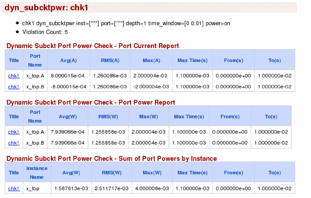 The above command reports the port current for all ports of all instances in the time window between 0 and 10ms. The report includes the current and power information for all subcircuit instances one level down the hierarchy.