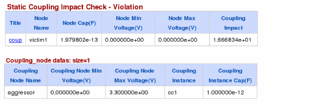 - The first section displays the node name of the victim. Next, the node capacitance (with respect to ground) of the victim is shown. The min/max voltage columns display the possible voltage range for this node. The coupling impact is a gauge used to measure the coupling impact of aggressor(s) on the victim. The coupling impact is a relative term and does not have any physical meaning.