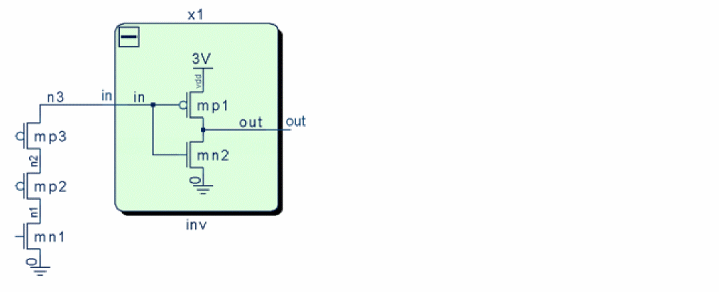 It reports one path from fanout n3 to gnd. The number of PMOS found in this path is two. Note that mn1 is an NMOS therefore does not contribute in the count.