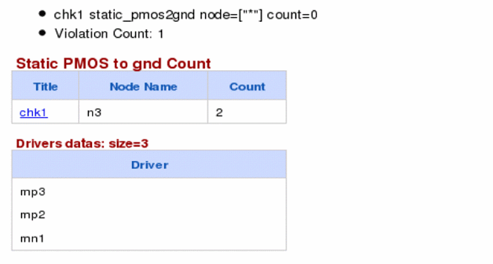 title static_pmos2gnd node=[n1 n2 ...] count=<value> <inst=[inst1 inst2...]> <xinst=[xinst1 xinst2...]> <subckt=[subckt1 subckt2....]> <xsubckt=[xsubckt1 xsubckt2....]> <depth=n> error_limit=<value>