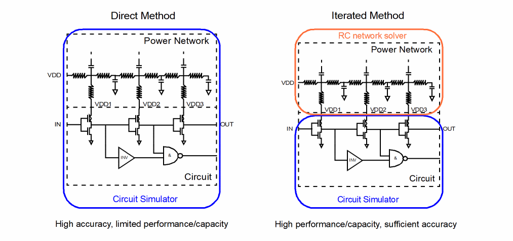 In an EMIR flow, a circuit is evaluated together with the parasitic resistor and capacitor network, which models the IR drop or the EM effect. There are two general approaches of solving such a problem: