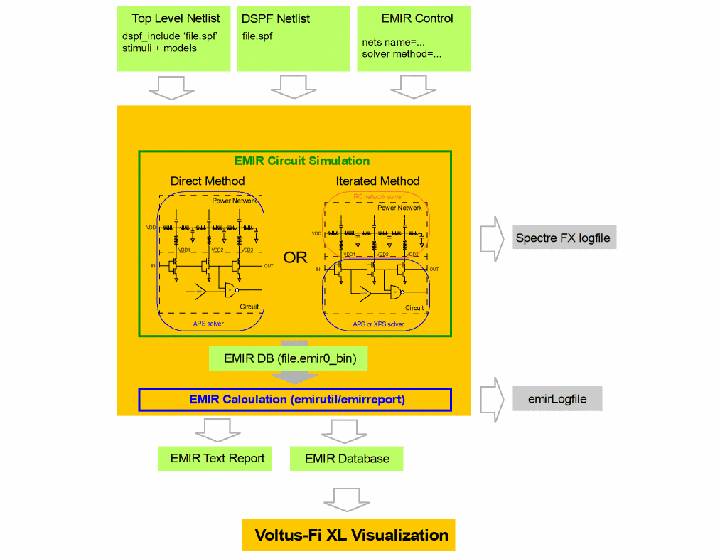 The EMIR product consists of the Spectre FX EMIR simulation and the Voltus-Fi XL visualization. The circuit and the RC network simulation are handled by Spectre FX EMIR. The result is stored in a binary database which contains the average, rms, max IR drop, and EM values. Voltus-Fi XL reads the information from the binary database, evaluates whether the currents are above the limits defined in the technology file, and visualizes the results in the layout.
