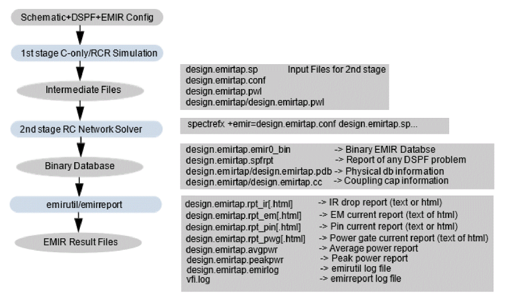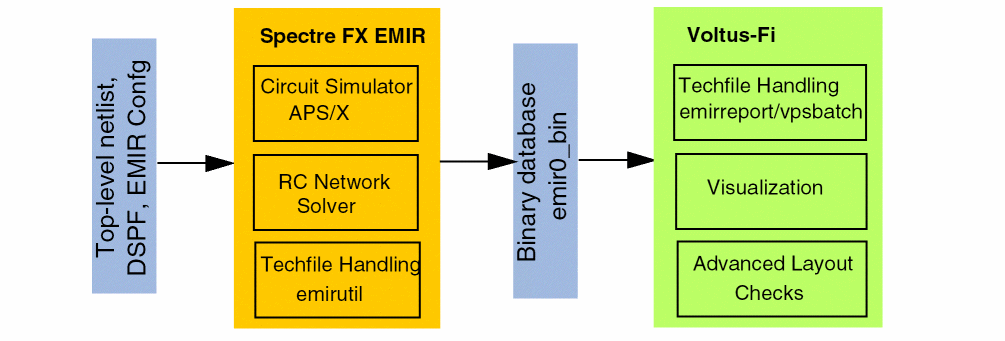 Note that while the Spectre FX EMIR flow uses the DSPF representation of the designs, it is not dependent on any post-layout backannotation or stitching capability. The flow also covers designs with power gates.