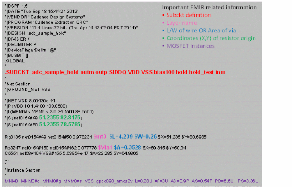 The Spectre FX EMIR flow is based on a DSPF representation of the analyzed design. The DSPF file is required to contain all electrical and geometric information needed for EMIR analysis. The following figure shows a representative DSPF netlist with all important information for EMIR being marked in color.
