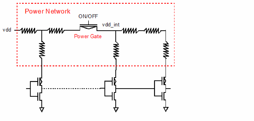 Power networks may contain power gates (four-terminal MOSFET device) which enable or disable the power supply in the circuit. These power gates split the power supply RC network into two parts; the RC network driving the power gate, and the RC network being driven by the power gate. These nets are strongly coupled together and they should be simulated together in EMIR analysis.