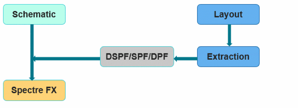 The simulation database is built upon the pre-layout netlist, as shown at the left of the figure. The parasitics from the parasitic files (DSPF/SPF/DPF) are backannotated into the database, as shown at the right. The hierarchy and the net names from the pre-layout netlist are retained, and the device models are regenerated according to the device parasitic information (DPF/Instance Section from the DSPF). The nodes are backannotated with R and C from the DSPF/SPF Net section.