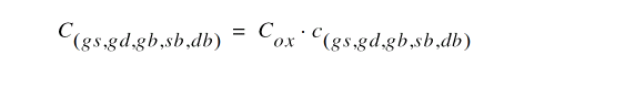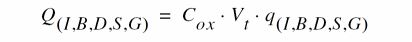 qOX is a fixed-oxide charge assumed to be zero. The preceding equation expresses the charge conservation among the four nodes of the transistor.