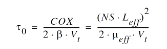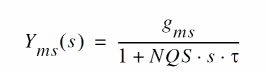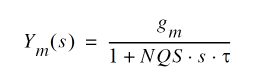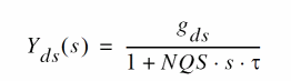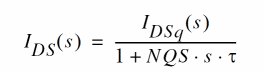 The EKV model includes a first-order NQS model for small-signal (.AC) simulations. The expression of the NQS drain current is obtained from the quasi-static value of the drain current, which is then first-order low-pass filtered. NQS is a flag (model parameter) allowing you to disable the NQS model, and τ is the bias-dependent characteristic time constant.