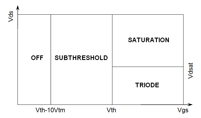 This section describes devices region for the BSIMSOI model. Device region is determined by both Vds and Vgs. The following figure shows the region of N-type BSIMSOI device. For P-type device, all the voltage in figure is negative.
