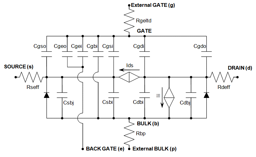 Because the BSIMSOI model is developed based on the BSIM3v3 model, it shares the similar basic equivalent circuit with the BSIM3v3 model except the part of floating body. The followings show the equivalent circuits for BSIMSOI devices: