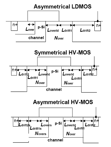 Three types of devices structure can be modeled since HiSIM_HV version 1.2.0 and 1.1.1: Asymmetrical LDMOS, Symmetrical HV-MOS and Asymmetrical HV-MOS. Model parameter COSYM determines the devices symmetry and Ldrift, the overlap length Lover, as well as the impurity concentration of the drift region Nover determine the characteristics of respectively side. In the LDMOS case independent structures at the source side and the drain side are distinguished, and the Ldrift region is not introduced at the source side. In the HVMOS case, the parameter values for the drain side have to be determined, and are copied to the source side automatically. If parameters for the source side are determined explicitly, these values are taken. If parameters are not determined, values at the drain side are taken. If the parameter values are not determined, default values are taken. This is valid for any structural cases. Fig. 31-3 shows three different devices structures and table 31-1 shows the model parameters used by different structures.