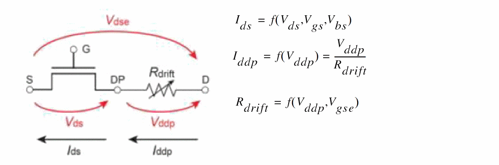 HiSIM_HV 1.2.0 additionally covers device structures with a substrate node Vsub. The substrate node bias Vsub,s increases the depletion width Wdep at the drift/substrate (NSUBSUB) junction. The Wdep extension into the drift region causes a reduction of the effective drift depth (DDRIFT), and thus an increase of the sheet resistance.