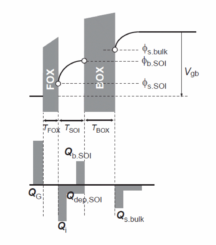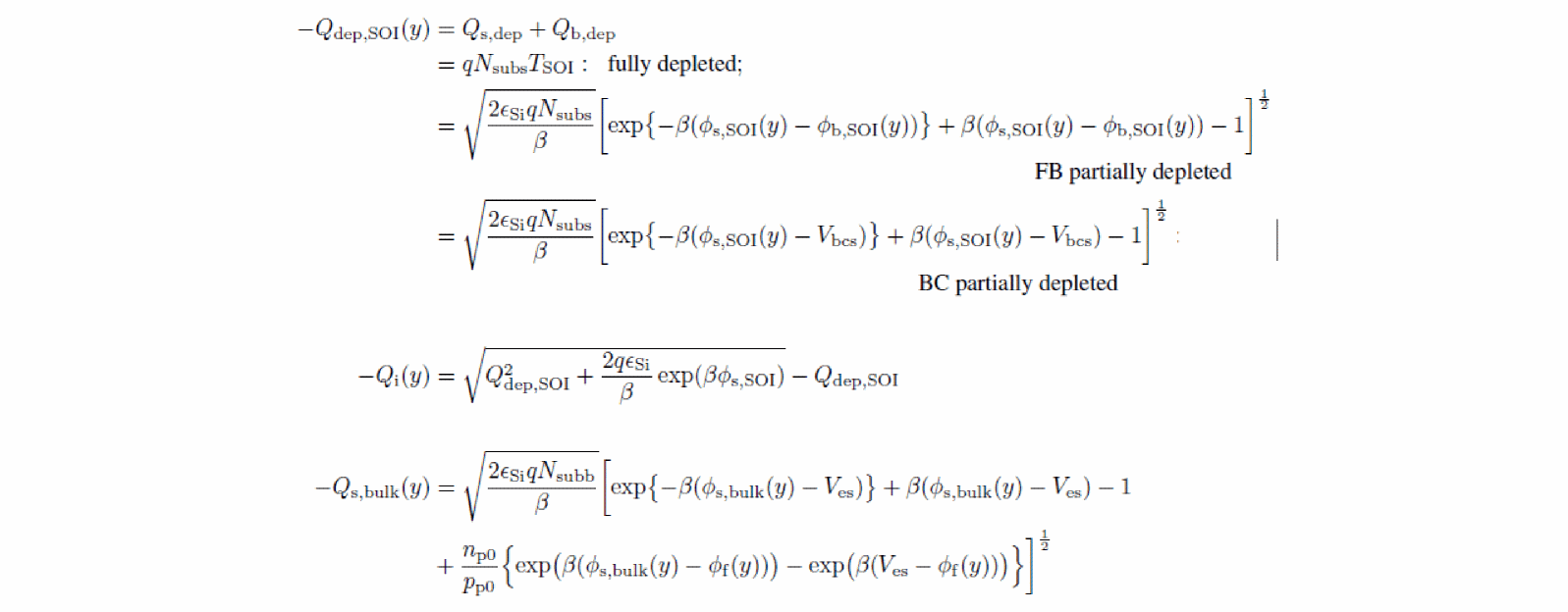 Though all following descriptions are written for the n-channel MOSFET, they are also valid for the p-channel case. The Poisson equation solved in HiSIM SOI together with the Gauss law and boundary conditions together with the approximation of the linearly decreasing carrier density to the depth direction are