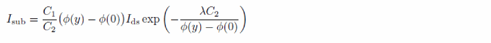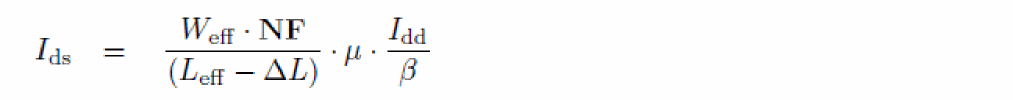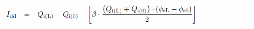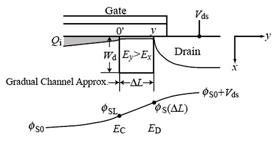 Under the gradual-channel approximation with further approximations of an idealized gate structure and uniform channel doping, the drain current Ids is written as:
