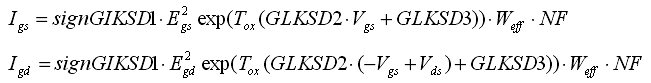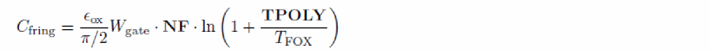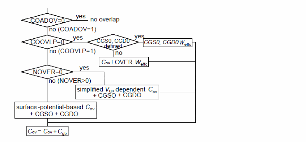 To consider the overlap capacitance, the flag COADOV must be selected to 1, which is the default. The overlap capacitance includes three options as summarized in 32-7, where the drain side and the source side are treated as identical. If Flag COOVLP=0, the overlap capacitances are treated to be constant. If CGSO and CGDO are defined, these values are taken. If they are not defined, the values are calculated with the overlap length LOVER and oxide capacitance CFOX.