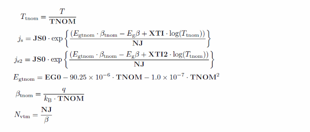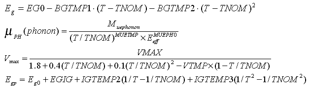 , which is the inverse of the thermal voltage. Additionally the band gap, the intrinsic carrier concentration, the carrier mobility, and the carrier saturation velocity are also temperature dependent.