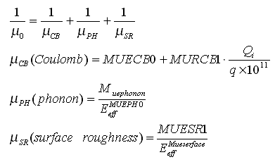 The low-field mobility is described with the following expressions and includes the three independent mechanisms of Coulomb, phonon and surface-roughness scattering: