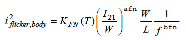 where f is frequency (in Hz ), afn and bfn are model parameters, KFN(T ) is the temperature dependent flicker noise coefficient, I21 is the DC current in the resistor body, and W and L are the resistor width and length respectively, in units micron (µm). If the switch parameter for flicker noise geometry calculation sw_fngeo is 0 (false) then W and L are design geometries, w_um and l_um respectively, else if it is 1 (true) then W and L are effective geometries, weff_um and leff_um respectively.