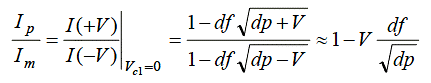 and therefore reveal the effect of depletion pinching. As with the low V bias analysis above, dp can be calculated and then df , or at least in initial value of it for optimization, can be determined from the slope of the ratio in the above equation versus V (once it stabilizes, the ratio tends to be noisy for low V).