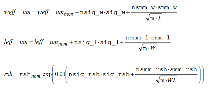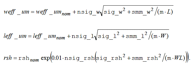 where the nominal values are those defined in the section on geometry dependence. (The above expressions are used to update the effective geometries and resistance values, and all previous model equations use the values calculated earlier. However, for clarity of presentation and ease of interpretation, the previous equations are not cluttered with the statistical variations).