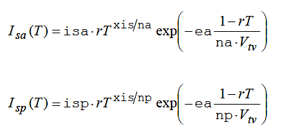 where rT is the ratio of device to nominal temperature (in Kelvin), and Vtv = kT/q is the thermal voltage. The temperature dependence of the junction built-in potentials is