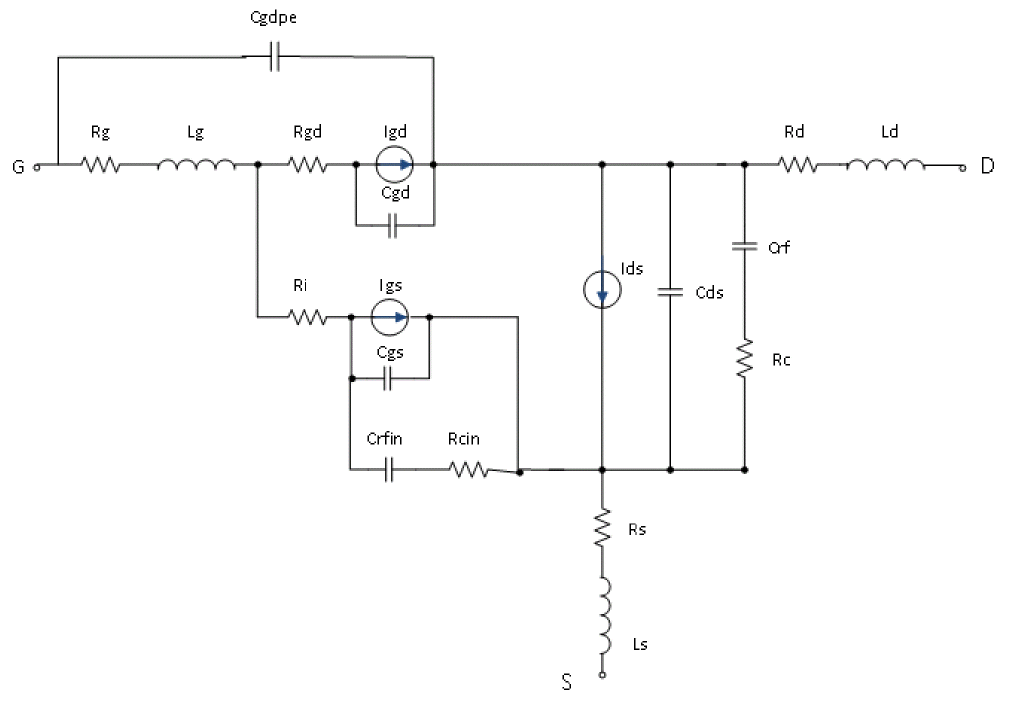 Parameters NoiseP, NoiseR, and NoiseC model the drain and gate noise sources, and their correlation.