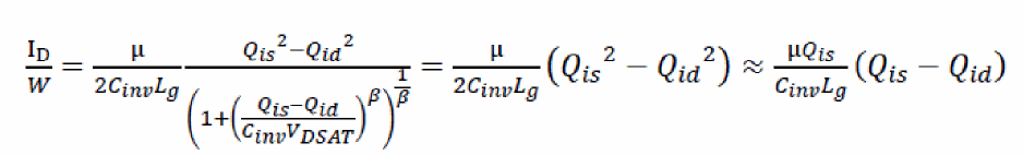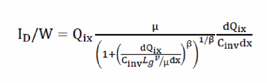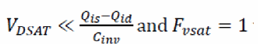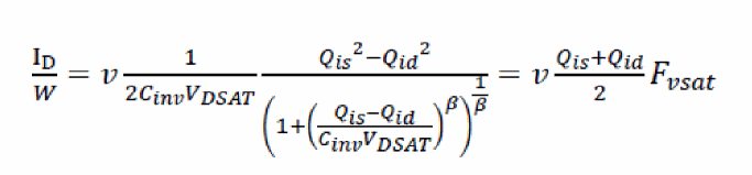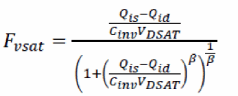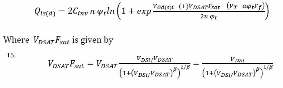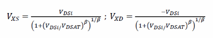 Here, complete S/D symmetry is achieved using the charge formulation shown above. The terms Vxs and Vxd are in turn required to include velocity-saturation effects as shown: