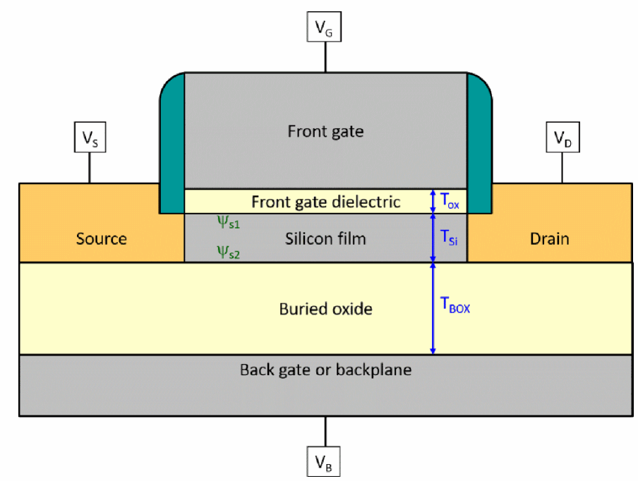 It is a schematic cross-section of a FDSOI transistor, describing the characteristic thicknesses and the surface potentials at the front (