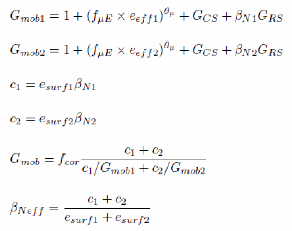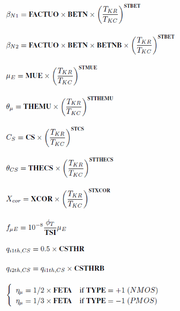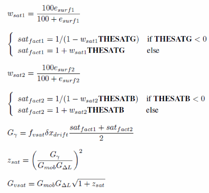 Notice the presence of the FACTUO pre-factor and of STBET in the temperature exponent. This contributes to decouple velocity saturation parameters from low longitudinal field mobility ones, and makes in particular STTHESAT the temperature exponent of the saturation velocity itself.