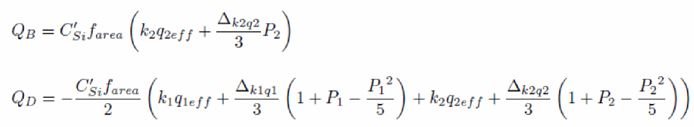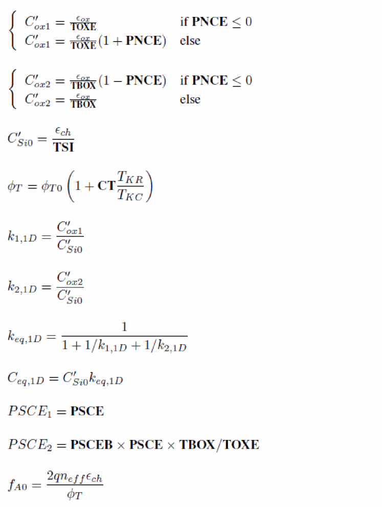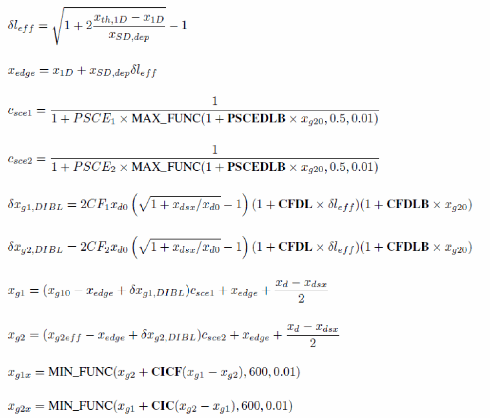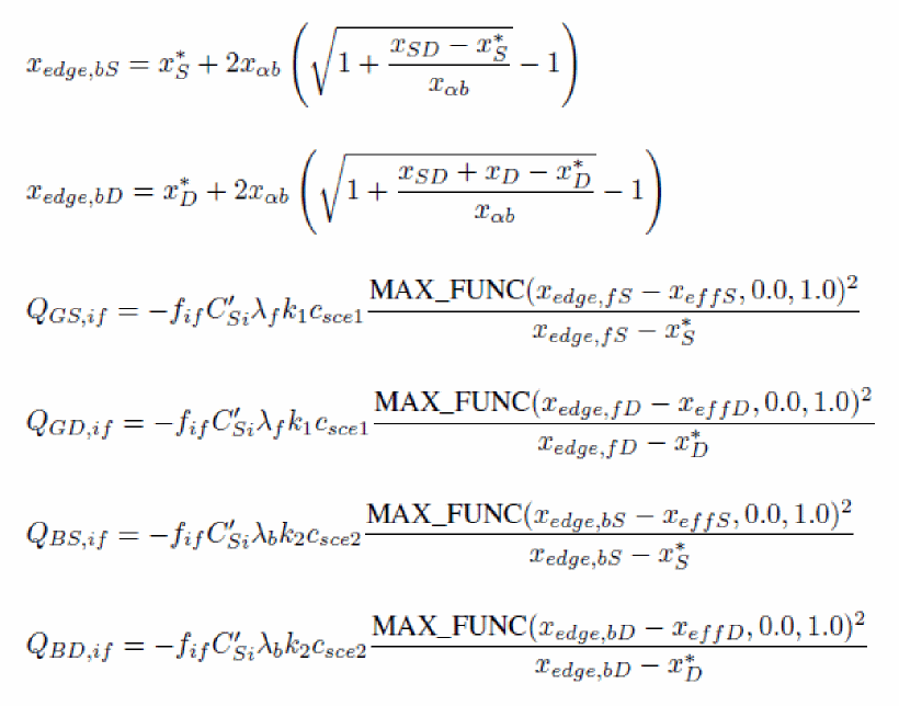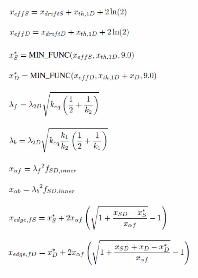 uses a PSP-like surface potential calculation sequence. This computation is based on the analogy that the backplane is considered as the channel of a bulk MOSFET, which gate electrode is the front gate and which gate oxide capacitance is equal to the front gate oxide capacitance in series with the channel film capacitance and the buried oxide capacitance. The detailed calculation of