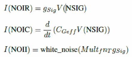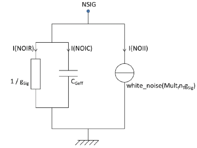 As there is no noise function with frequency dependence suitable for the induced gate noise in VerilogA, an internal node NSIG linked to the ground through a parallel RC circuit is used.