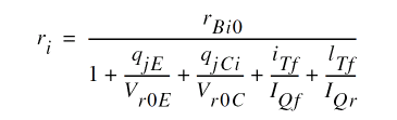 where rBi0 is the geometry dependent zero-bias value, and the denominator represents the conductivity modulation. The above equation has been derived from HICUM level-2 by introducing certain simplifications. Note, that VroC is close to the Early voltage VEf for BJTs but generally differs from VEf for HBTs.