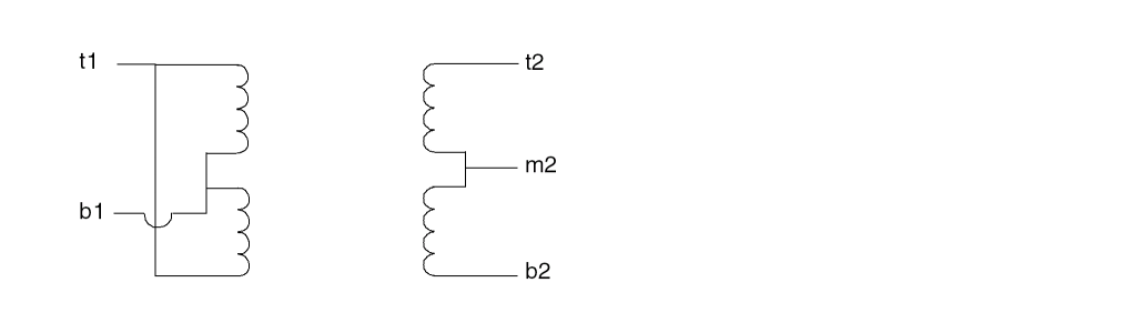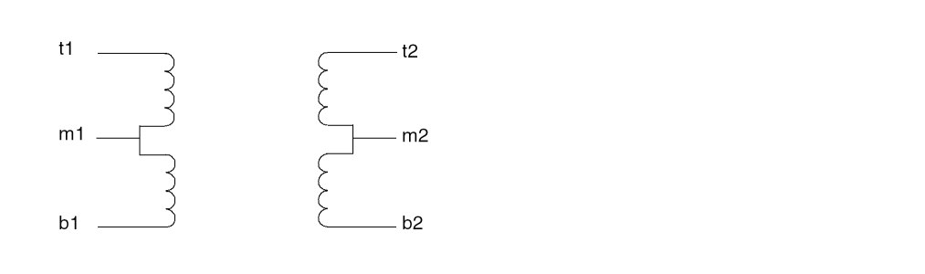 subckt ct_xfmr (t1 b1 t2 m2 b2) Tt t1 b1 t2 m2 transformer n1=2 Tb t1 b1 m2 b2 transformer n1=2 end ct_xfmr