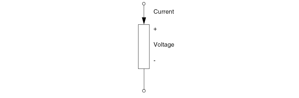 The reference direction for the voltage is positive when the voltage of the + terminal is higher than the voltage of the – terminal. A positive current arrives through the + terminal and leaves through the – terminal.