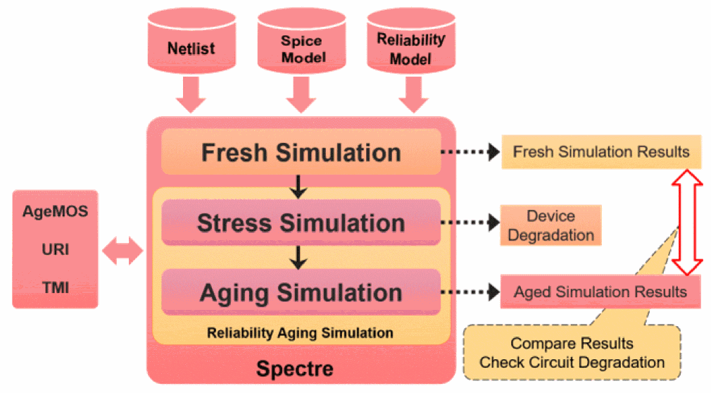 To perform electrothermal simulation on the same design, to add a reliability block containing the thermal analysis statement which defines the thermal configuration file (see Technology Overview) and invoke the Spectre command the same way as a regular postlayout simulation: