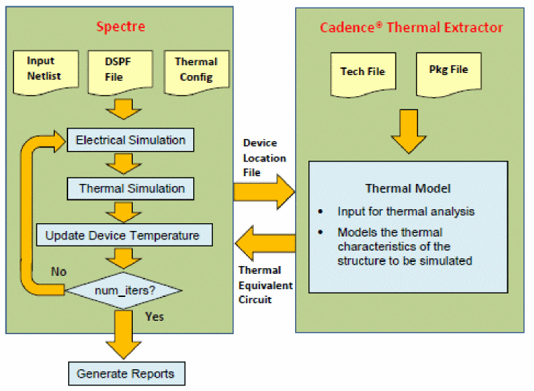 Once the thermal model is built, Spectre performs thermal simulation using the thermal model generated by Cadence® Thermal Extractor: