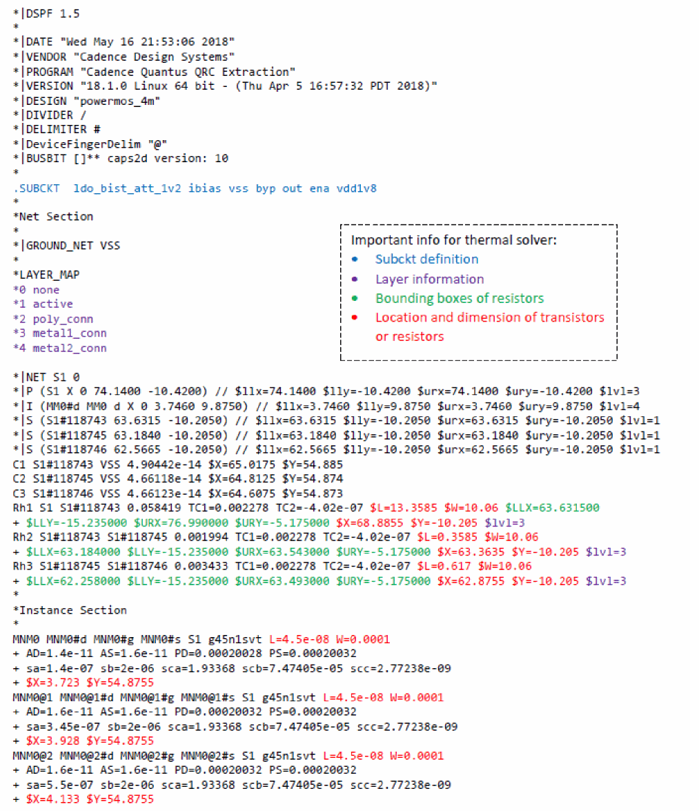 To perform Spectre thermal analysis, the first step is to prepare the simulation testbench including the postlayout data of the design, and the DSPF files with device location and dimension information for the transistors, resistors, diodes, and so on, in the instance section. A dspf_include statement is required in the Spectre thermal analysis flow to identify the DSPF data.