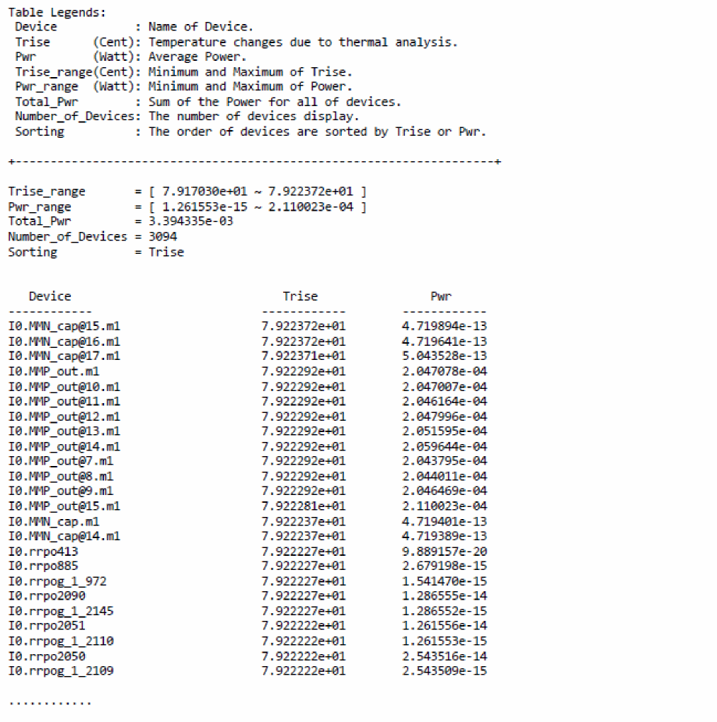 Spectre thermal analysis generates a report file with the extension .thermal_rpt and the iteration count in the raw file directory after each iteration. It reports the temperature rise and power value on each device in the DSPF file. The last of these reports can be used as the final result of the electrothermal analysis. The following is a sample report that is generated: