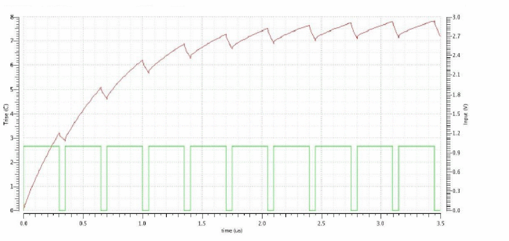 With Spectre dynamic thermal analysis, the transient temperature waveforms on the designated instances are saved in a file in the raw file directory with the extension .temp_probe.tran.tran. The instances for which the temperature waveforms are desired are defined with the save_inst option to the thermal analysis statement in the testbench. Along with the temperature waveform, the instantaneous power waveform of the designated instances is also saved in the same file. Without providing a list of instances with the save_inst option, no instance temperature and power waveforms are saved. However, Spectre always save the minimum or maximum instance temperature rise and the total power of the entire design in the .temp_probe.tran.tran file regardless of whether any instance is provided in the save_inst option. The following is a temperature waveform of a device in a design plotted along with the input signal waveform: