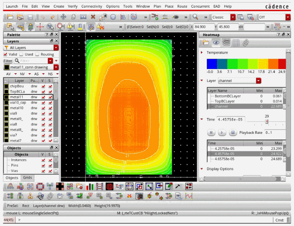 When you run the Spectre thermal analysis, a thermal analysis database is created that is similar to the simulation waveform data. The thermal database consists of the thermal database (.tdb) and temperature (.temp_grid) files. The Virtuoso ADE heat map viewer can read these .tdb and .temp_grid files to generate a thermal map of the thermal simulation results.