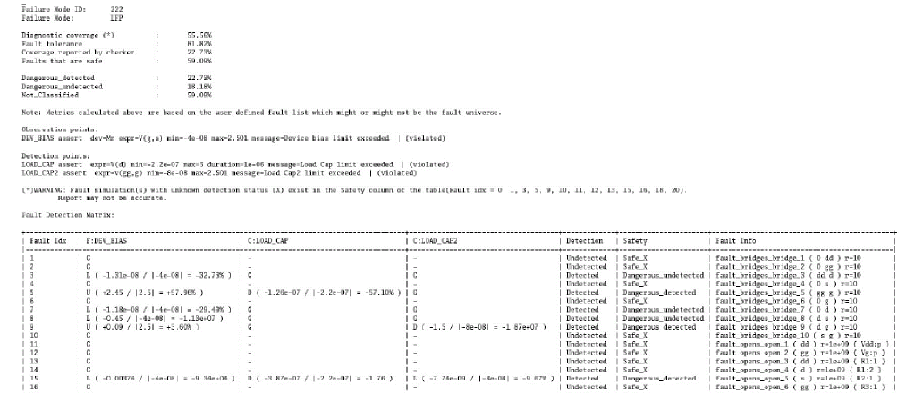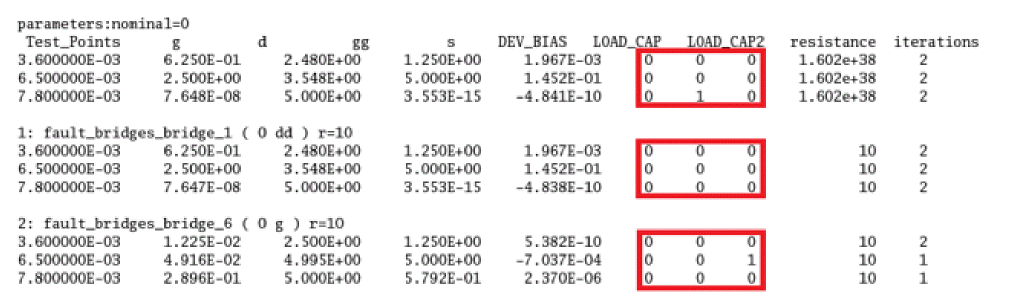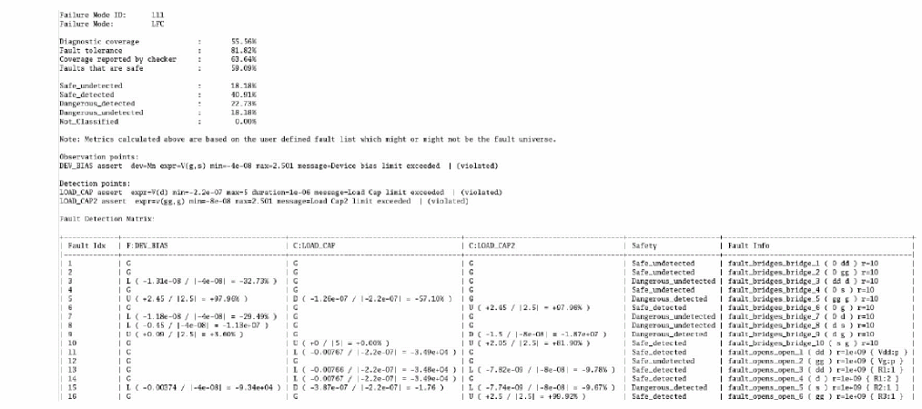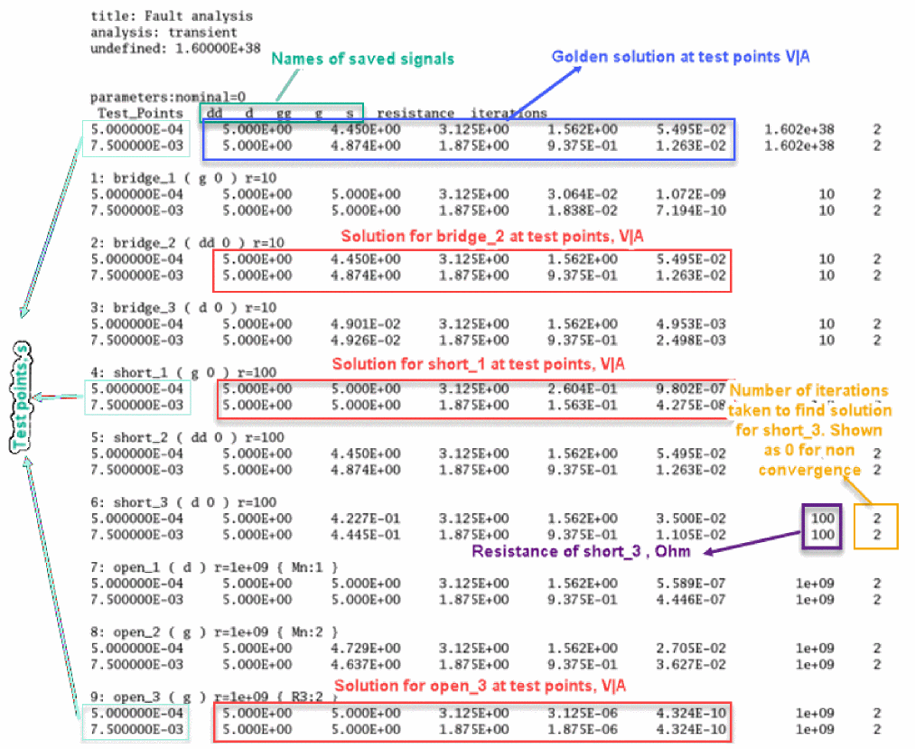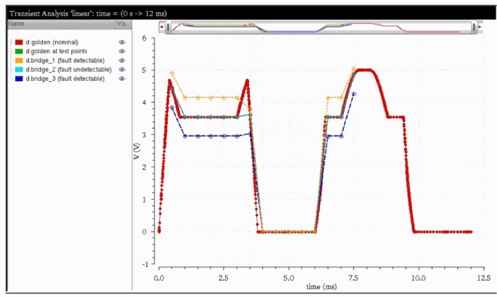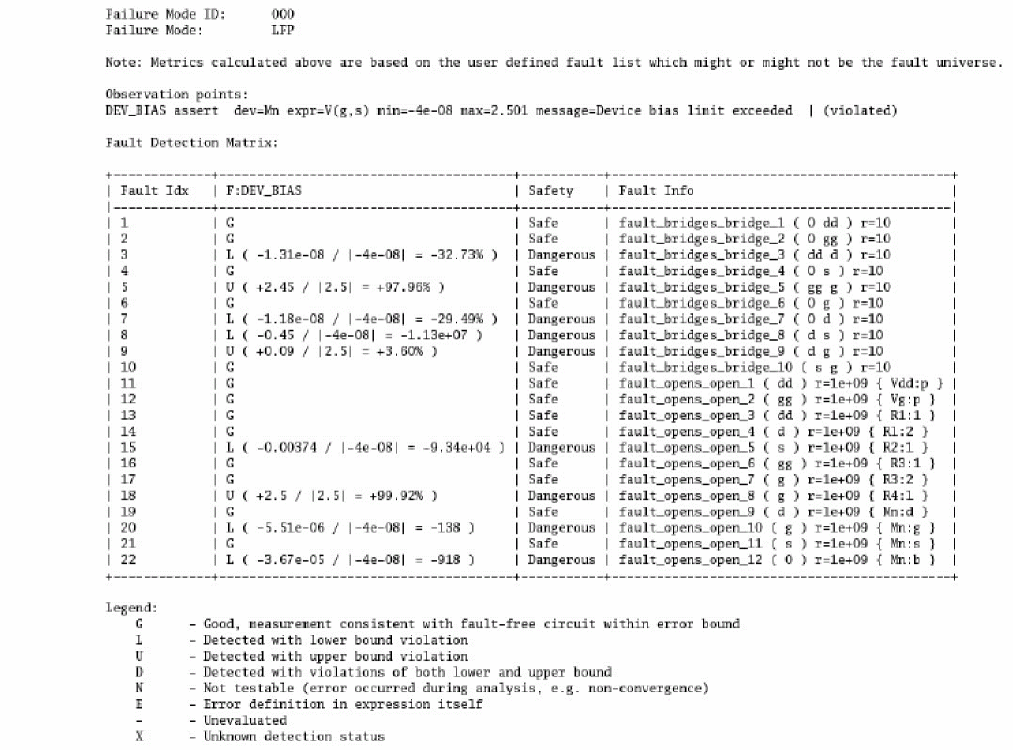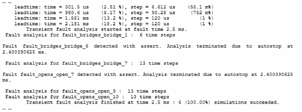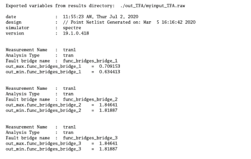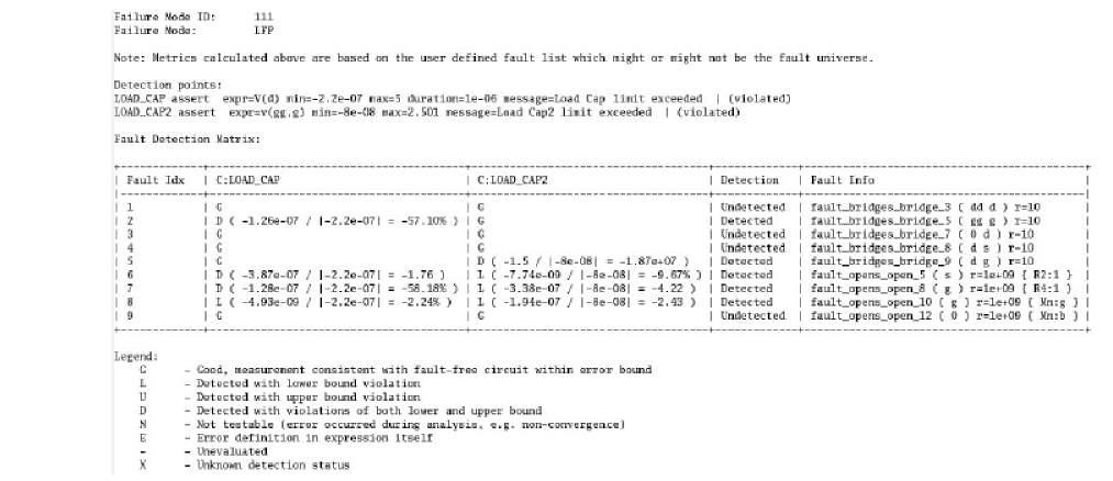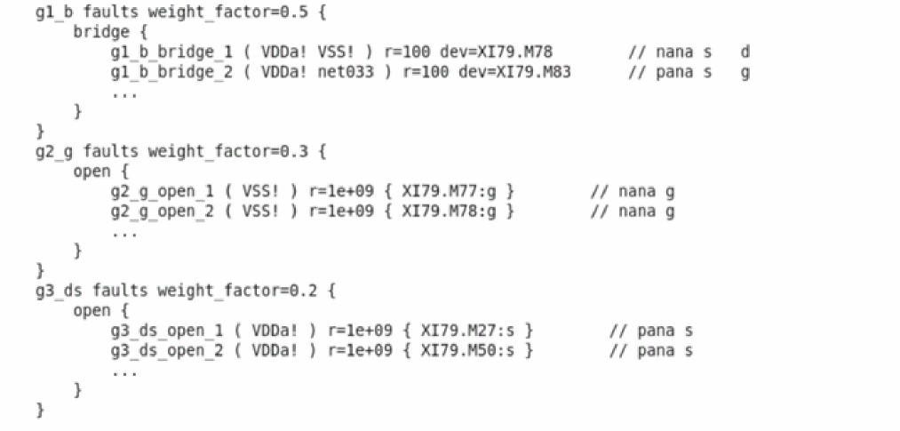 fault)—Provides a transistor-level simulation capability that can be enabled in an analog test methodology to improve test coverage by identifying critical test patterns. Spectre transient fault analysis is very fast in handling a large numbers of faults. Spectre direct fault analysis provides high accuracy results when full fault analysis precision is required. For more information, see Fault Analysis. -