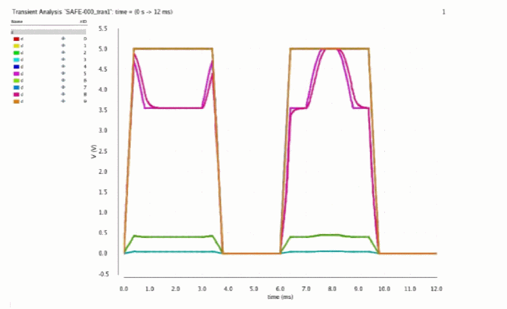 tran)—Computes the transient response of the circuit over a specified time interval. You can specify initial conditions for this analysis. If you do not specify initial conditions, the analysis starts from the DC steady-state solution. You can influence the speed of the simulation by setting parameters that control accuracy requirements and the number of data points saved. For more information about the transient analysis, see Transient Analysis. -