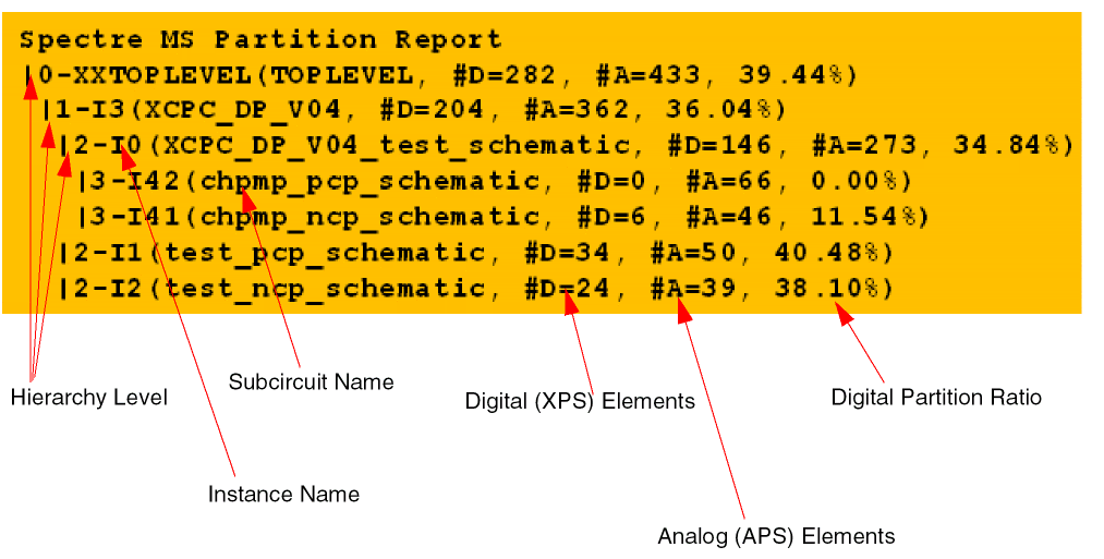 Spectre MS provides the ability to print a partitioning report. The report provides information about the analog and digital portions of each subcircuit instance with more than 50 elements.