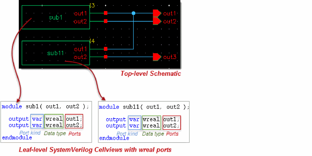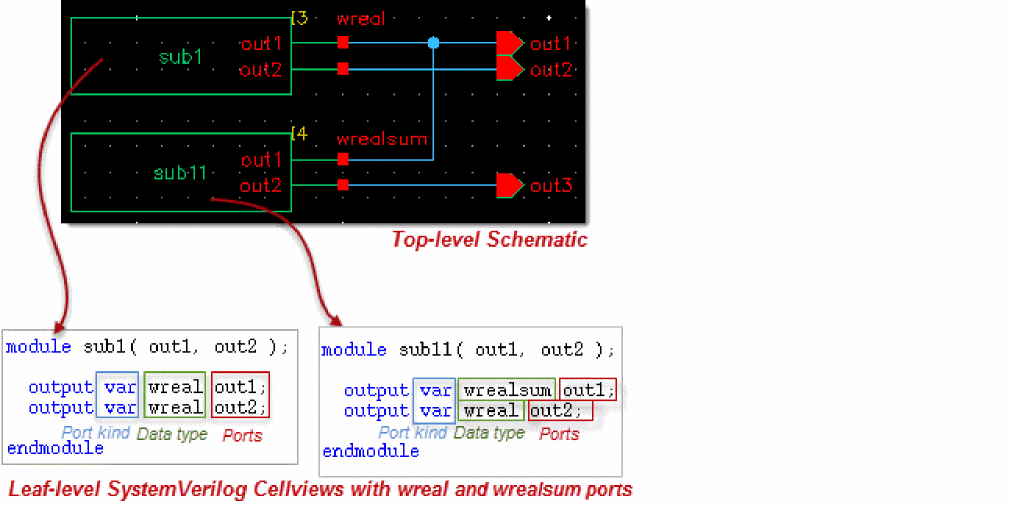 It is possible that two instances connected to a port have different SystemVerilog data types. For example, in the following design, the top-level schematic contains instances of the SystemVerilog cellviews sub1 and sub11. Cellview sub1 has wreal ports. Cellview sub11 has port out1 of the data type wrealsum, and port out2 of the data type wreal.