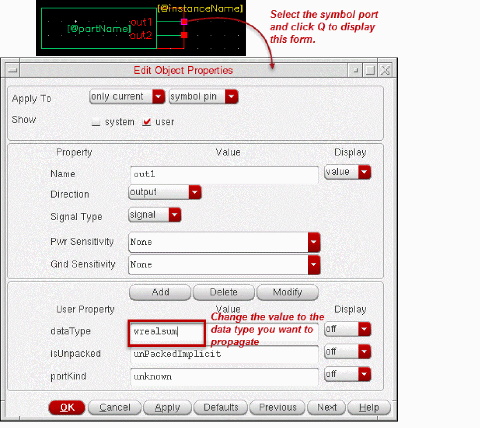 sub11symbol in Virtuoso Symbol Editor. Then perform step 2 to step 5 to change thedataTypeproperty value of the symbol portout1towrealsum. - Open the top-level schematic that contains the updated symbols.